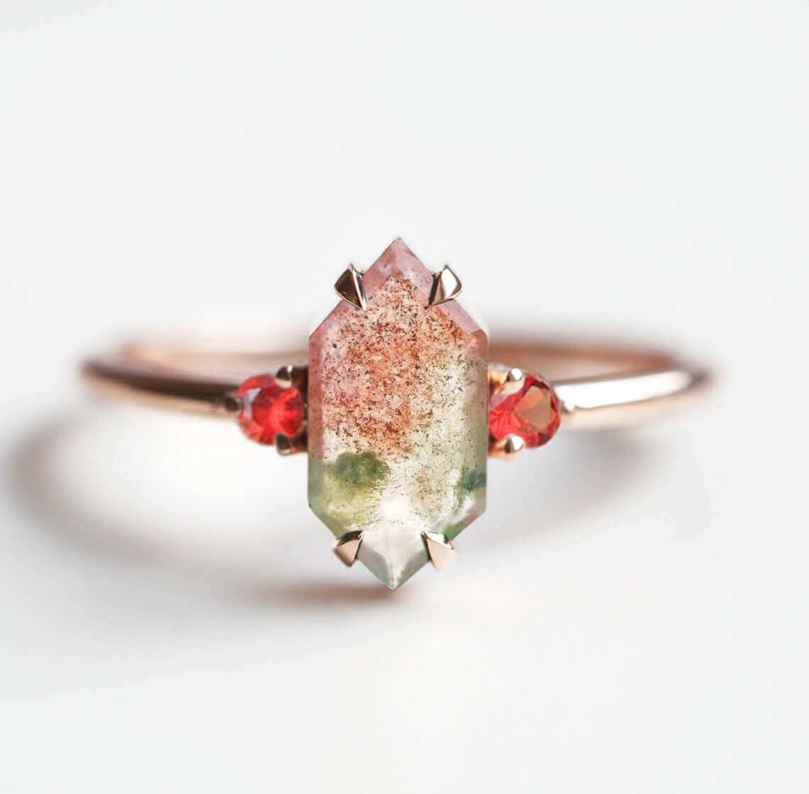 Trendolla 14K Gold Diamond Moss Agate And Red CZ Diamond Ring Set